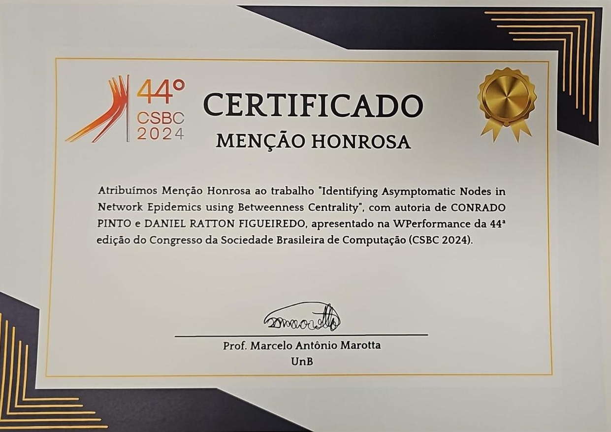 O artigo intitulado "Identifying Asymptomatic Nodes in Network Epidemics using Betweenness Centrality" de autoria de Conrado Catarcione Pinto (mestrando PESC) e Daniel Ratton Figueiredo (PESC) - seu orientador no PESC - recebeu o Prêmio de Menção Honrosa no WPerformance 2024.
