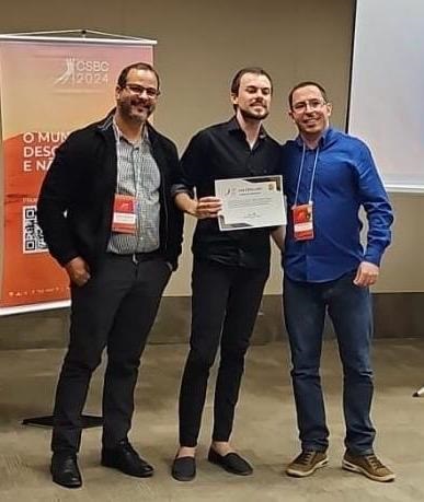 Abaixo foto da cerimônia de Premiação do Melhor Artigo com Prof. Gustavo Bittencourt Figueiredo e Prof. Rodolfo Ipolito Meneguette (Organizadores do WPerformance 2024) e Conrado Pinto.