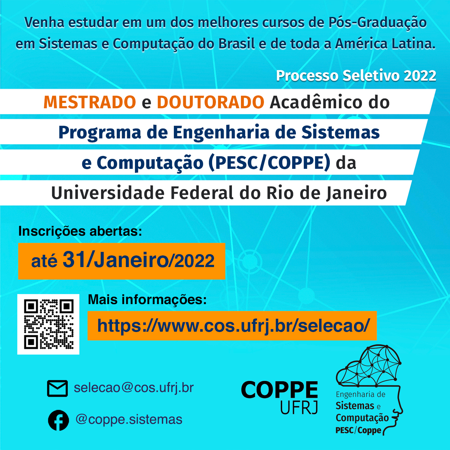 Encontram-se abertas as inscrições ao Processo Seletivo para Ingresso no Mestrado ou no Doutorado do PESC em 2022!