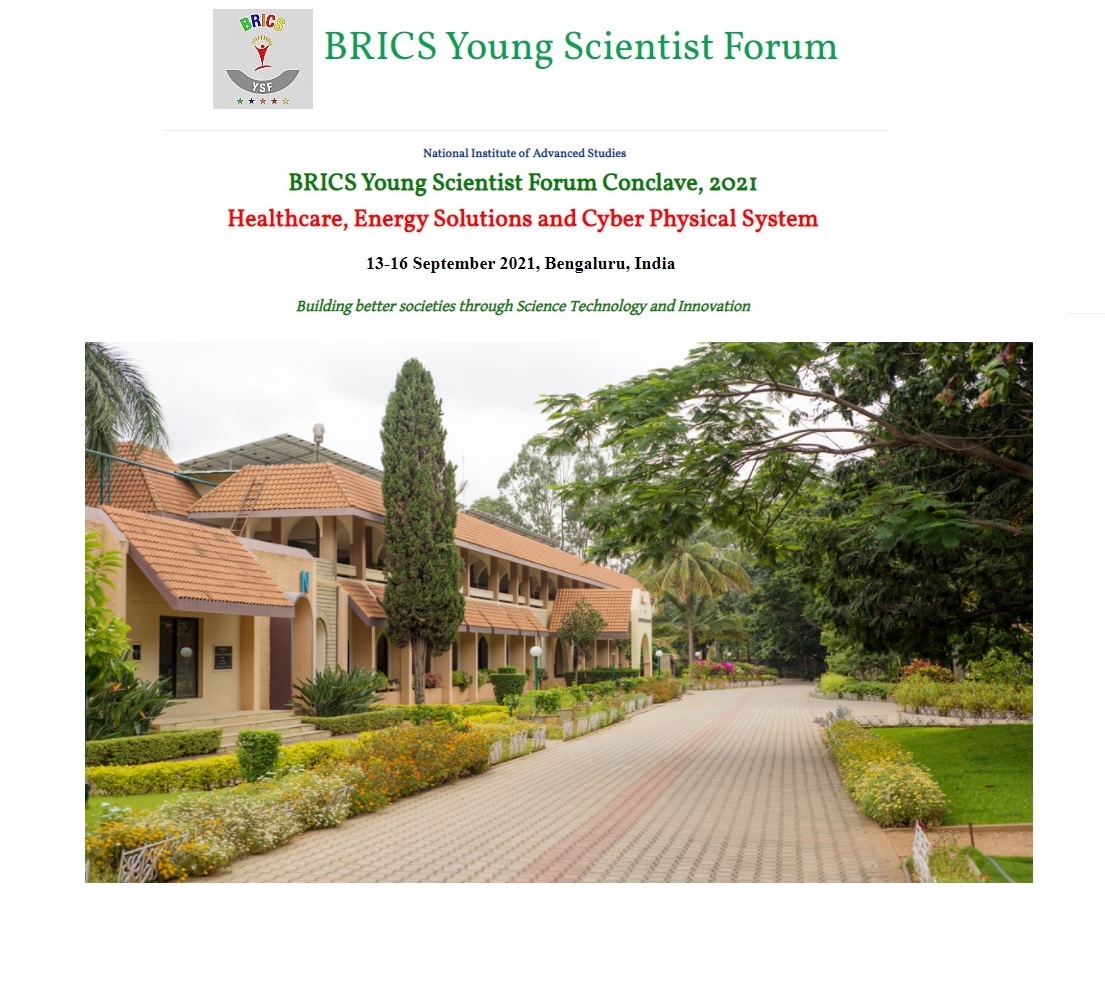 O National Institute of Advanced Studies está realizando, de 13 a 16 de Setembro de 2021, em Bengaluru (India) e de forma on line, o BRICS Young Scientist Forum Conclave 2021, com o tema Healthcare. Energy Solutions and Cyber Physical System.