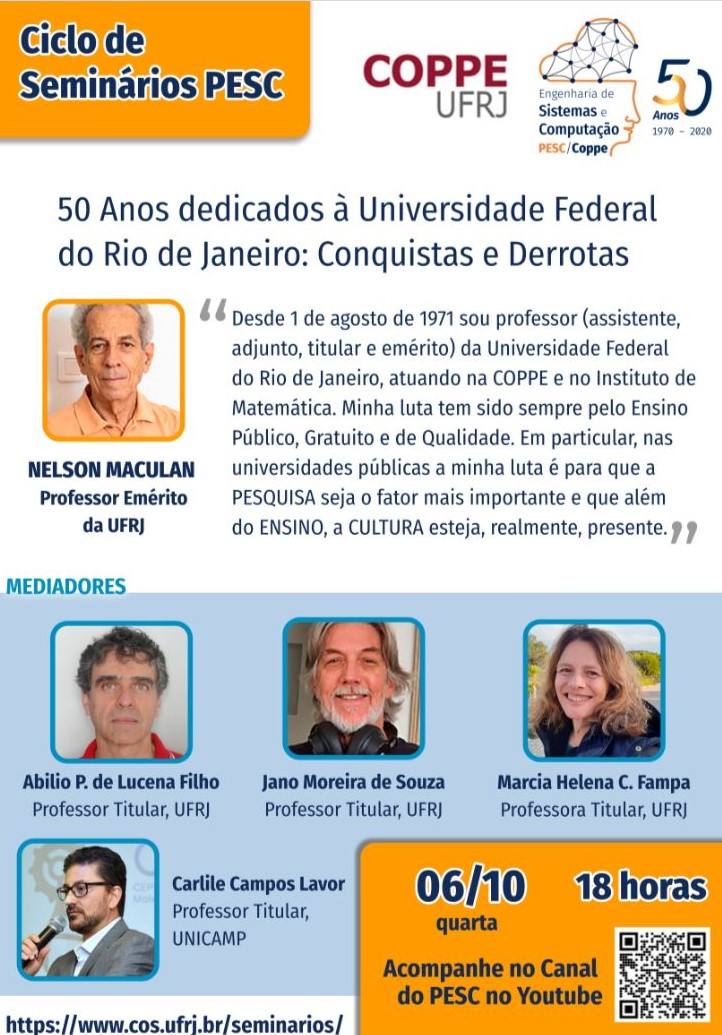 “50 anos dedicados à Universidade Federal do Rio de Janeiro: conquistas e derrotas” é o tema da palestra do próximo Ciclo de Seminários PESC, a ser proferida, dia 06 de outubro, às 18 horas, pelo professor emérito Nelson Maculan (PESC). O evento virtual será transmitido, ao vivo, pelo Canal do PESC no YouTube clicando aqui.