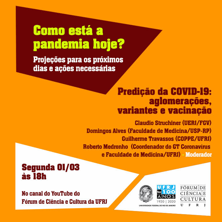 O Fórum de Ciência e Cultura/UFRJ promovem um debate sobre o tema HOJE (segunda, 1/3) que irá reunir especialistas de diversas áreas para discutir a situação atual da pandemia e as estratégias de enfrentamento, bem como a importância da divulgação científica nesse combate.