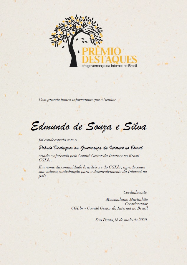 O Prof. Edmundo (PESC) foi um dos condecorados com o prêmio "Destaques em Governança da Internet no Brasil".
