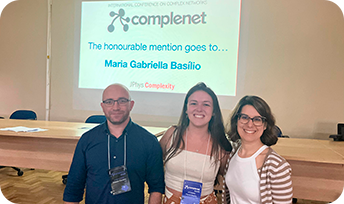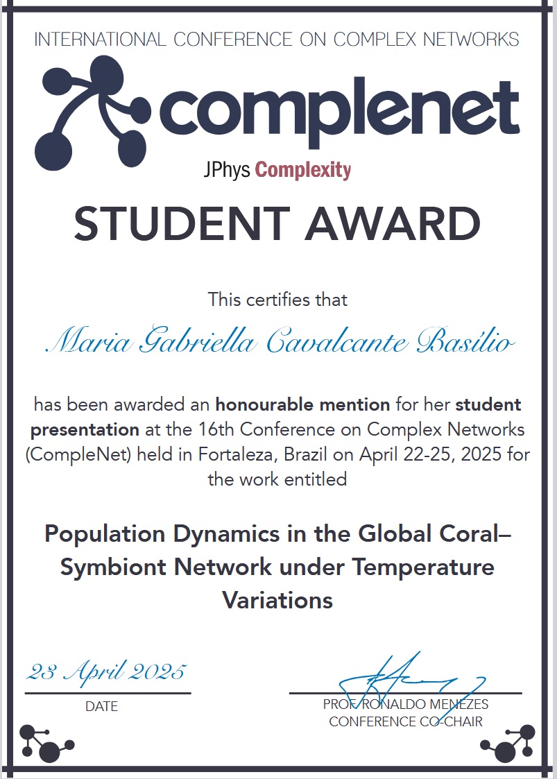 Maria Gabriella Cavalcante Basílio, aluna de Mestrado do PESC, orientada pelo Prof. Daniel Ratton Figueiredo, recebeu Menção Honrosa pela apresentação como estudante de seu artigo intitulado "Population Dynamics in the Global Coral-Symbiont Network under Temperature Variations" na 16th Conference on Complex Networks (CompleNet) realizada em Fortaleza entre 22-25 de abril de 2025.