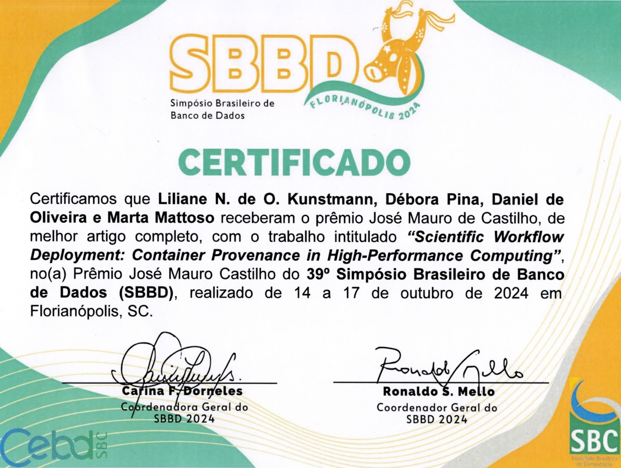 O artigo intitulado “Scientific Workflow Deployment: Container Provenance in High-Performance Computing”, possui como co-autores, a Débora Pina (doutoranda do PESC), o Prof. Daniel de Oliveira (UFF), e a Prof. Marta Mattoso (PESC).