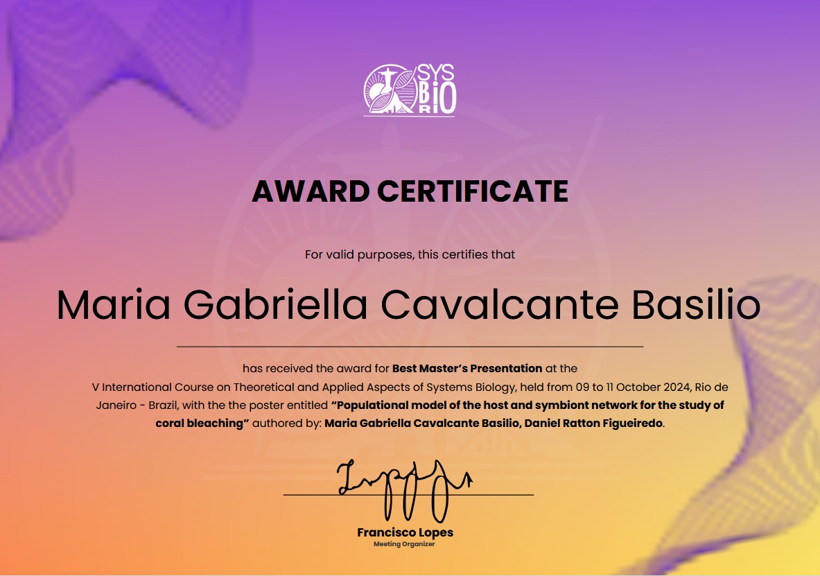 Maria Gabriella Cavalcante Basilio, mestranda do PESC, recebeu o Prêmio de Melhor Apresentação pelo trabalho intitulado "Populational model of the host and symbiont network for the study of coral bleaching" apresentado como pôster no V International Course on Theoretical and Applied Aspects of Systems Biology, realizado de 9 a 11 de outubro, no CCS/UFRJ.