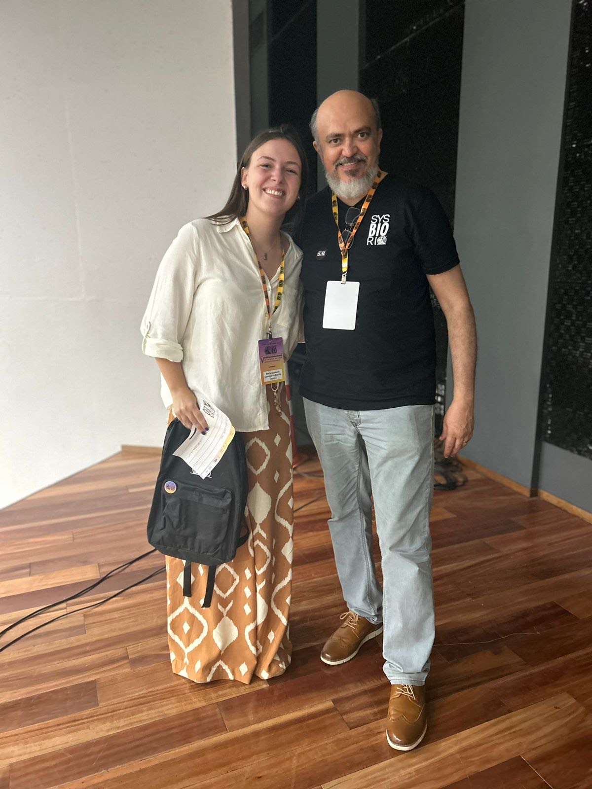 Abaixo foto da premiação, Gabriella com o Prof. Francisco Lopes (UFRJ-Caxias) co-organizador e palestrante do V SYSBIORIO