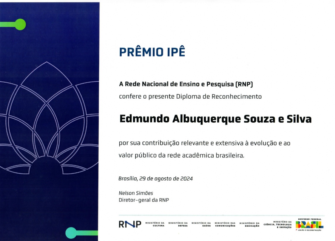O Prof. Edmundo Albuquerque de Souza e Silva (PESC) foi agraciado, em 29 de agosto último, com o PRÊMIO IPÊ da Rede Nacional de Ensdino e Pesquisa (RNP).