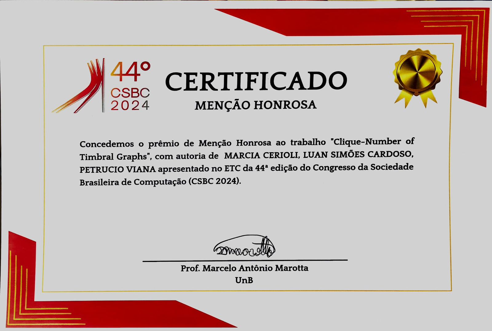 O artigo intitulado "Clique-Number of Timbral Graphs" de autoria de Márcia Rosana Cerioli (profa. PESC), Luan Simões Cardoso (mestrando PESC) e Jorge Petrúcio Viana (prof. UFF) recebeu o Prêmio de Menção Honrosa no ETC 2024.