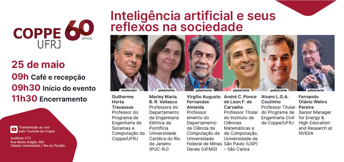 A COPPE – Instituto Alberto Luiz Coimbra de Pós-Graduação e Pesquisa de Engenharia - comemorando seus 60 Anos, está organizando o debate “Inteligência Artificial e Seus Reflexos na Sociedade”, no próximo dia 25 de maio, às 9 horas, no auditório do CT2.