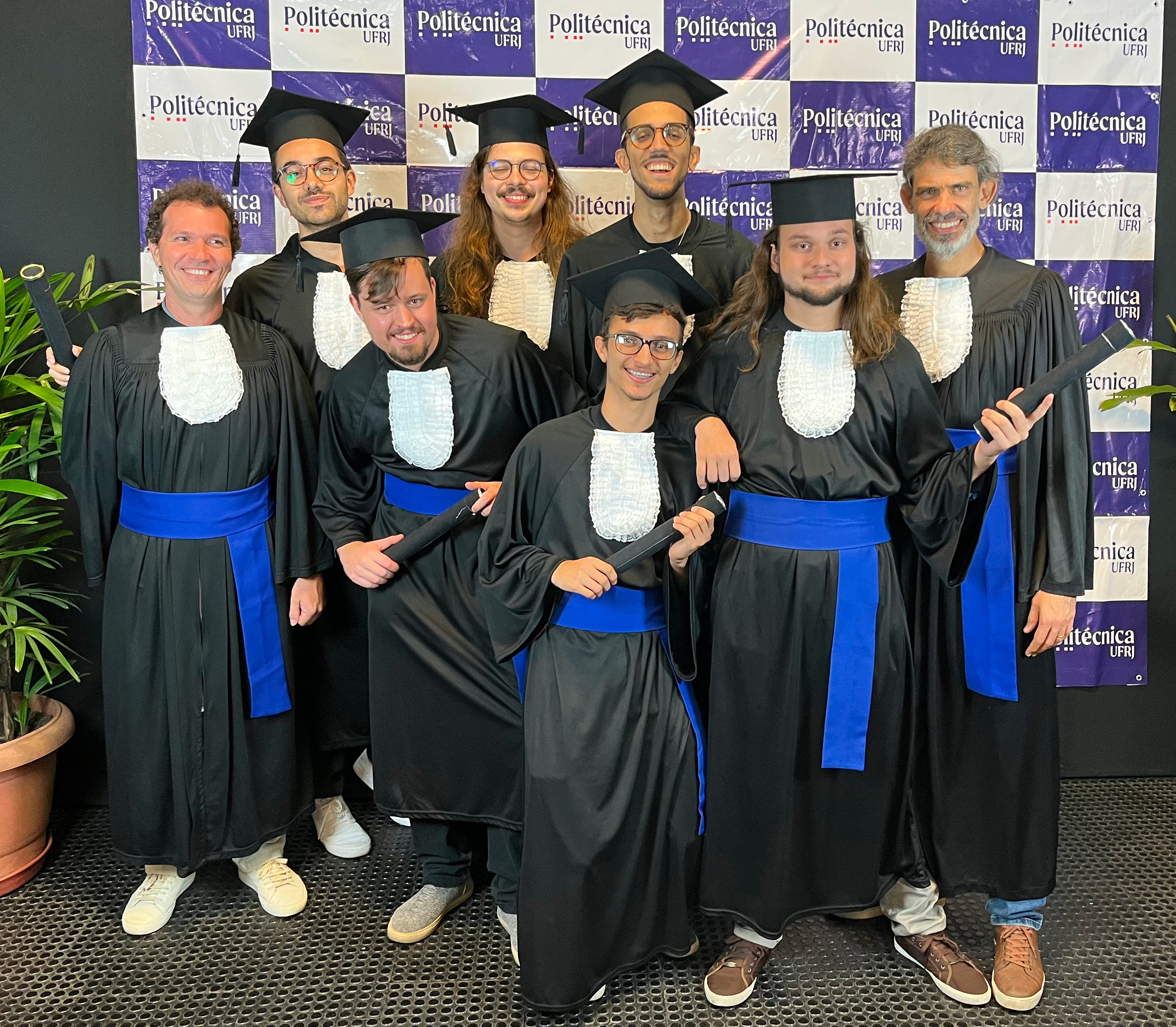 Abaixo foto durante o evento, com: Daniel Ratton Figueiredo (paraninfo), Lucas Santiago Peixoto, Gustavo Pires Machado, Pedro Maciel Xavier, Gabriel de Oliveira da Fonseca, Flávio Luis de Mello (professor homenageado), e na frente, Cainã Figueiredo Pereira, e João Victor Almeida Davim.